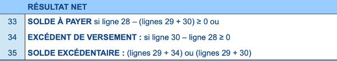 · Le reste de la TVA à régler est ensuite automatiquement calculé sur la ligne 33. Si tu dois au contraire être remboursé.e d’un montant de TVA (parce que ta TVA déductible est supérieure à ta TVA collectée, mais c’est peu probable), ce sera indiqué dans ce même bloc du formulaire.