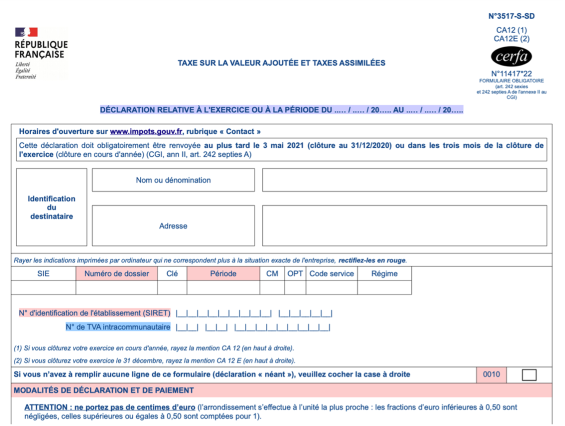 Il est aussi possible que tu n'aies pas de TVA à régler, mais au contraire de la TVA à te faire rembourser. Dans ce cas, il te faudra remplir un formulaire 3519 accompagné des justificatifs d'achats pour faire la demande de crédit de TVA.